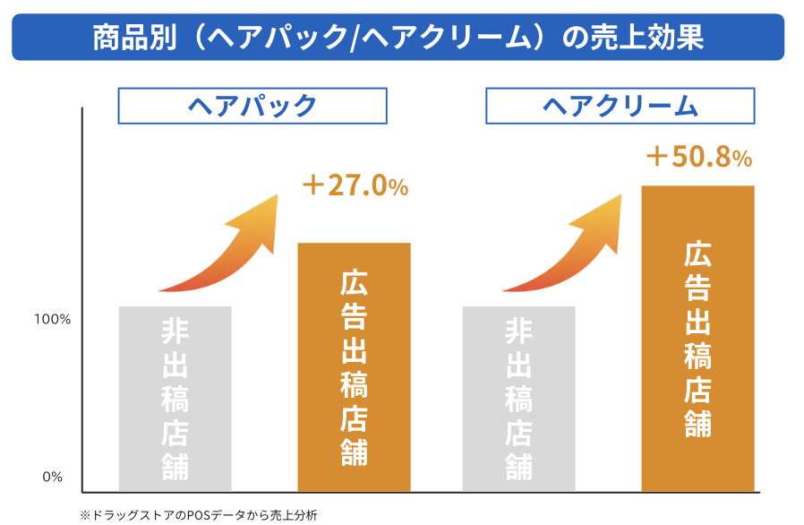 今回の広告出稿による効果を見ると、ヘアパックは 27.0%アップ、ヘアクリームは 50.8%アップと大幅に売上が伸びました。特にヘアクリームは、出稿店舗での購入が集中したことが売上拡大に大きく寄与しています。