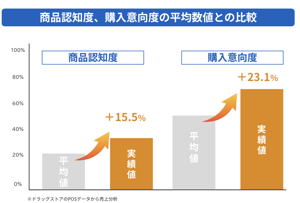 商品認知度が平均値よりも15%以上、購買意向度が20%以上アップ!